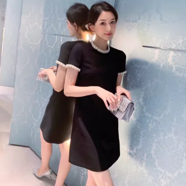 パーティードレス レディース 演奏会ドレス 結婚式ドレス ワンピースドレス ミニワンピース シンプル 無地 半袖ワンピース パール きらきら ビーズ 装飾 ラウンドネック きれいめ エレガント 女性
