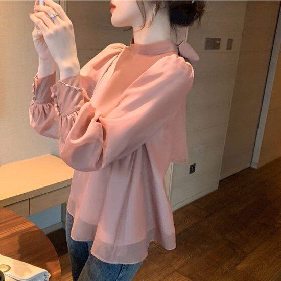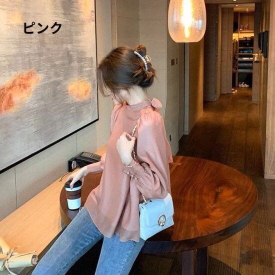 長袖ブラウス レディース シフォンブラウス バックリボン スタンドカラー ハイネック プルオーバー パフスリーブ リボン レトロ 2color エレガント 上品 フェミニン シアー シャツ おしゃれ
