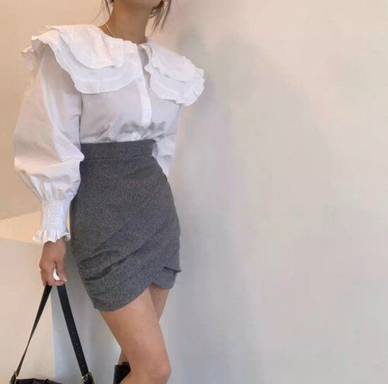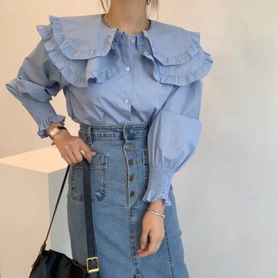 フリルブラウス レディース パフスリーブ 長袖 シャツ ブラウス ビッグカラー セーラーカラー シャーリング ボリューム レトロ クラシカル 2color ガーリー エレガント カジュアル おしゃれ
