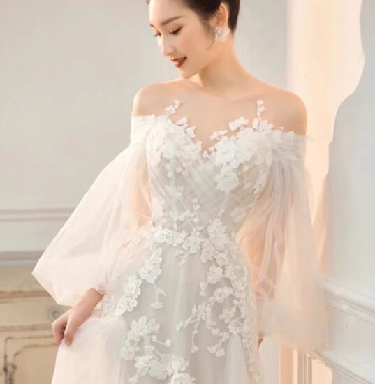 ウエディングドレス レディース 結婚式ドレス パーティードレス ブライダルドレス 花嫁 オフショルダー ロングドレス ボリューム袖 きれいめ エレガント 海外ウエディング レース 披露宴 結婚式 女性