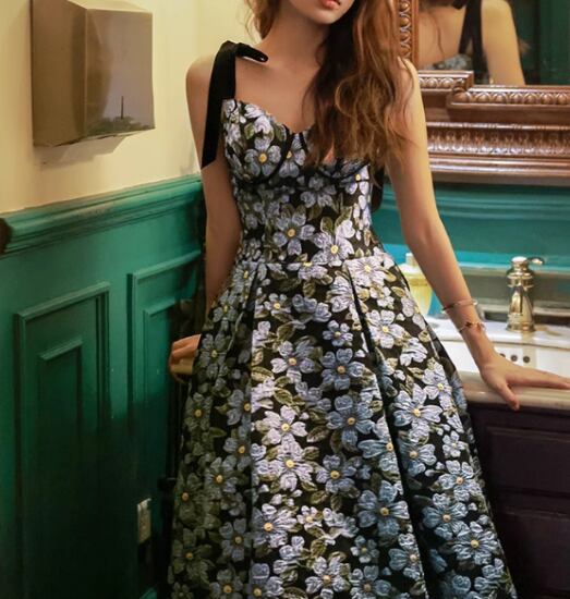 花柄ワンピース レディース ワンピース キャミソールワンピース ミドル丈ワンピース 総柄 フラワー 肩リボン ハイウエスト Aラインスカート キュート 可愛い カジュアル きれいめ おしゃれ 女性