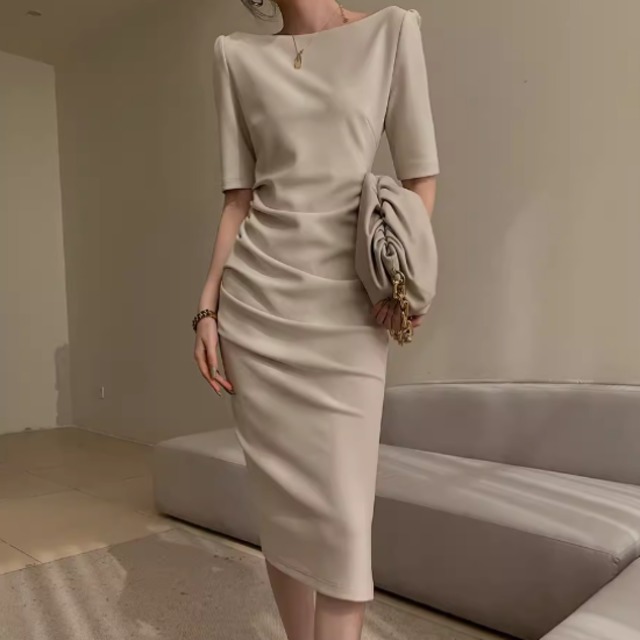 ミドル丈ワンピース レディース ワンピース 半袖ワンピース シンプル 無地 スリット ボートネック きれいめ エレガント カジュアル お出かけ おしゃれ お呼ばれ フォーマル スリムフィット 女性
