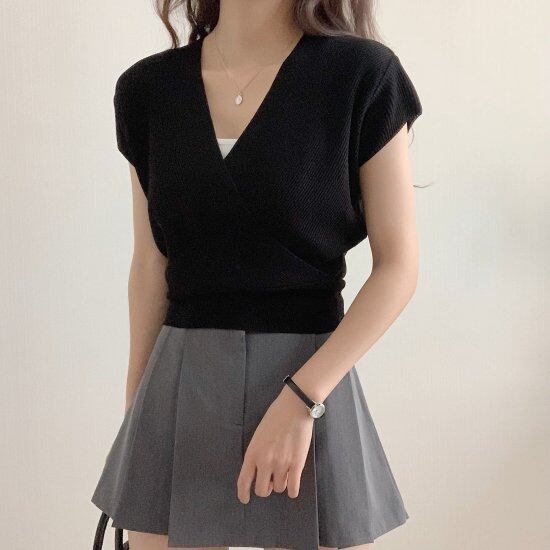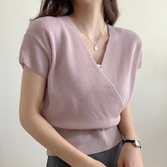 半袖ニット レディース サマーニット Vネック カシュクール ショート丈 クロップド丈 セーター プルオーバー レトロ クラシカル 5color きれいめ かわいい カジュアル オフィス おしゃれ