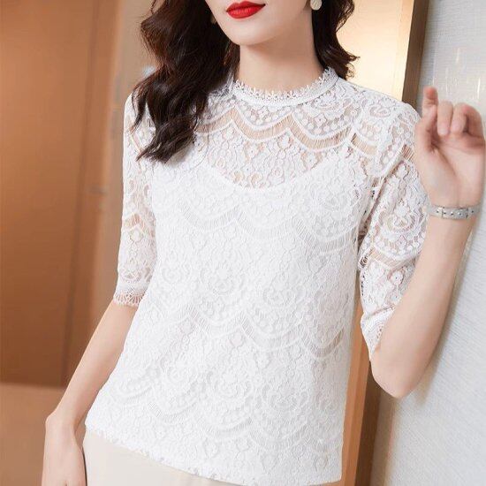 レースブラウス レディース レースプルオーバー 半袖 ブラウス シャツ プルオーバー 五分袖 ラウンドネック ハイネック シアー シースルー レトロ クラシカル エレガント 2color おしゃれ