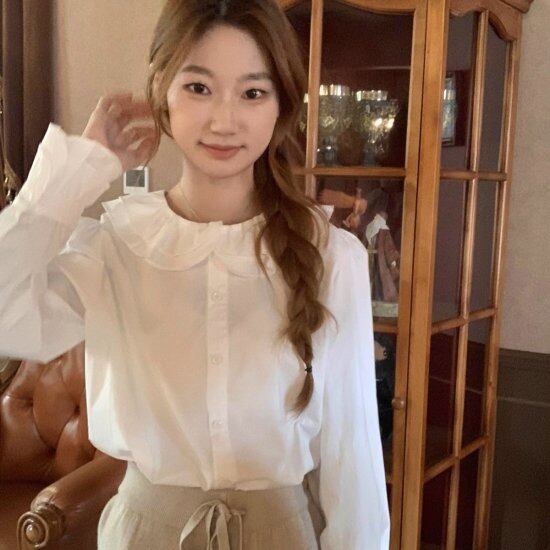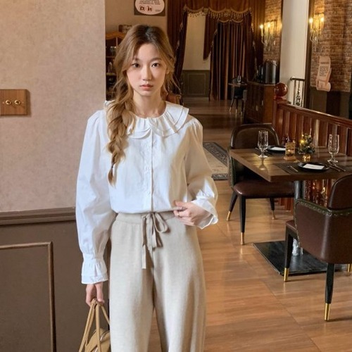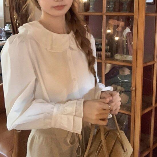 長袖ブラウス レディース フリルカラー シャツ ブラウス 長袖 フリル コットン 無地 シンプル レトロ クラシカル かわいい ガーリー フェミニン カジュアル エレガント おでかけ おしゃれ