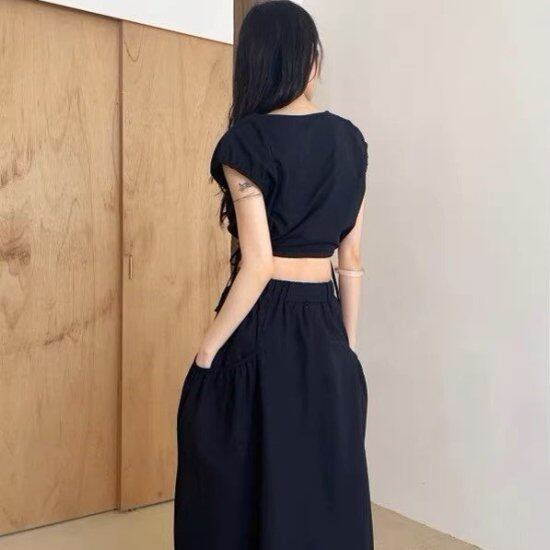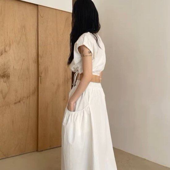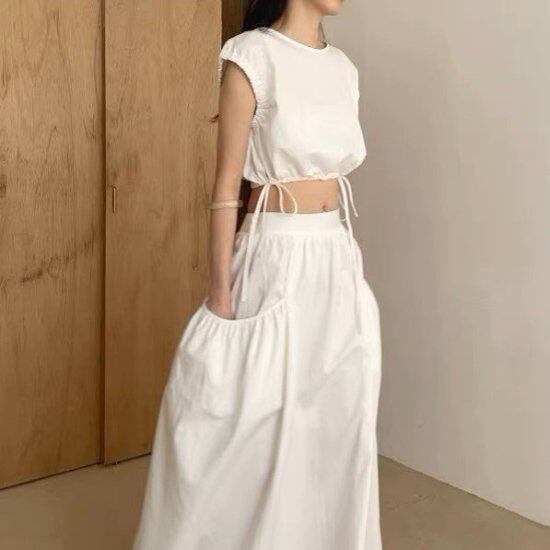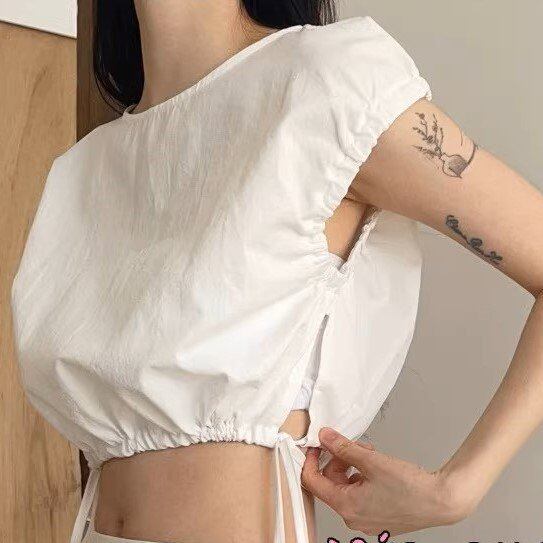 クロップドシャツ レディース ドローストリング ノースリーブ フレンチスリーブ ラウンドネック ショート丈 ベスト ブラウス プルオーバー 無地 個性的 カジュアル モード ストリート おしゃれ