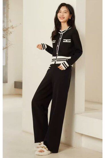 セットアップ レディース ニットスーツ 長袖 バイカラー ニット セーター プルオーバー ハート ビジュー ワイドパンツ ロング ニットパンツ 3color レトロ きれいめ カジュアル おしゃれ