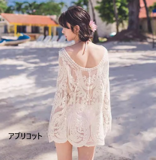 カバーアップ レディース 長袖トップス 総レース フェミニン 日焼け防止 UV対策 ビーチウェア カジュアル メッシュ ラウンドネック 体型カバー カジュアル 海 ビーチ プール リゾート 海水浴
