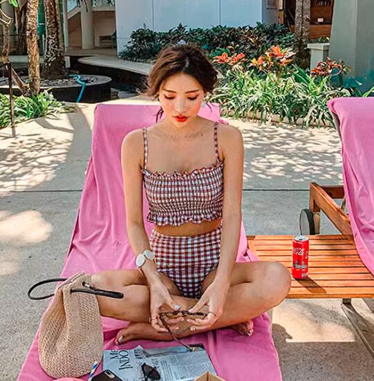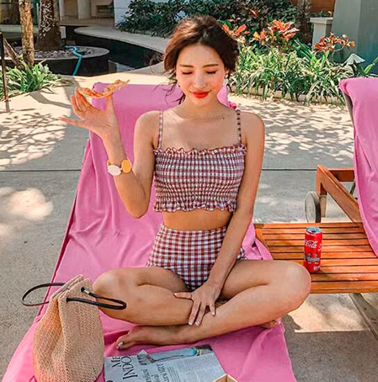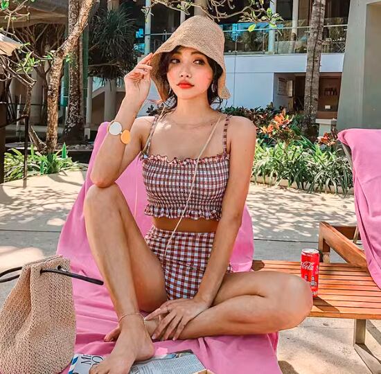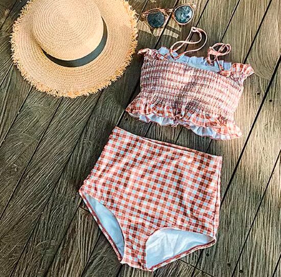 ビキニ レディース 水着 2点セット ツーピース チェック柄 格子柄 ハイウエスト フリル 体型カバー カジュアル おしゃれ スイムウェア ビーチウェア 海 プール 夏 海水浴 リゾート キュート
