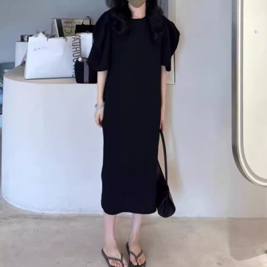 ミドル丈ワンピース レディース ワンピース 半袖ワンピース ミモレ丈ワンピース シンプル 無地 ラウンドネック パフスリーブ 大きいサイズ きれいめ エレガント お呼ばれ フォーマル おしゃれ 女性