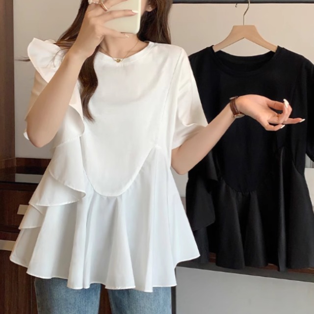 半袖Tシャツ レディース トップス カットソー フリル フェミニン ラウンドネック アシンメトリー 体型カバー フレア 大きいサイズ カジュアル お出かけ おしゃれ プルオーバー ブラック ホワイト