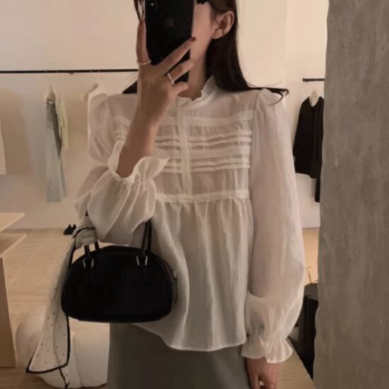 長袖ブラウス レディース トップス ブラウス シャツ フリルカラー キャンディスリーブ プルオーバー シンプル 無地 カジュアル お出かけ おしゃれ きれいめ エレガント オフィス 薄手 春夏 女性