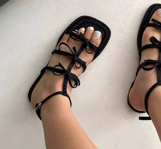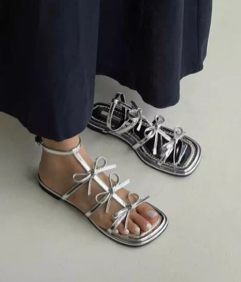 フラットサンダル レディース 靴 シューズ サンダル リボン オープントゥ アンクルストラップ 歩きやすい 疲れにくい 黒 ブラック シルバー カジュアル お出かけ おしゃれ 女性 ファッション