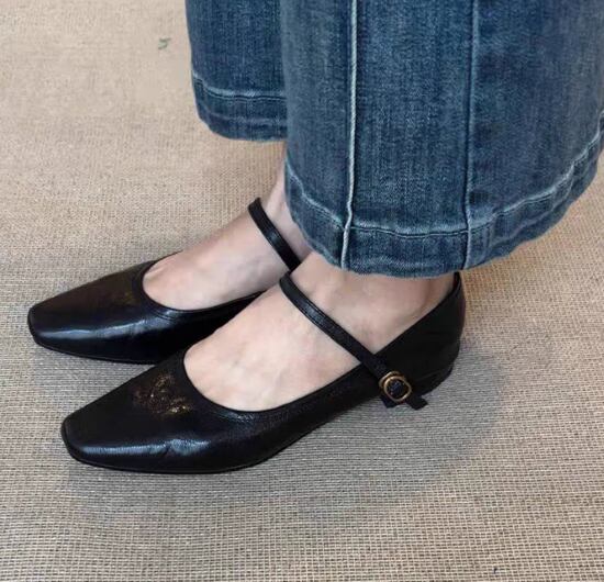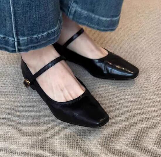 バレエシューズ レディース 靴 シューズ パンプス ローヒール ストラップ シンプル 無地 スクエアトゥ 履きやすい 歩きやすい 疲れにくい レトロ 牛革 レザー きれいめ カジュアル お出かけ 女性
