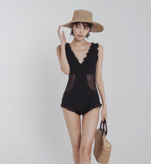 ワンピース水着 レディース 水着 スイムウェア ビーチウェア フリル Vネック サイドメッシュ 背中開き セクシー 体型カバー カジュアル ブラック 海 ビーチ プール 海水浴 バカンス 夏 おしゃれ