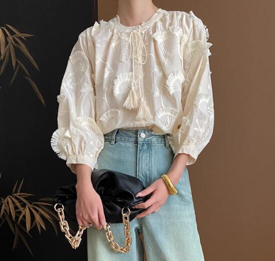 長袖ブラウス レディース トップス シャツ タッセル 扇形 フロントボタン ラウンドネック ホワイト コットン 綿 カジュアル お出かけ おしゃれ きれいめ 立体的 刺繍 個性的 ファッション 女性