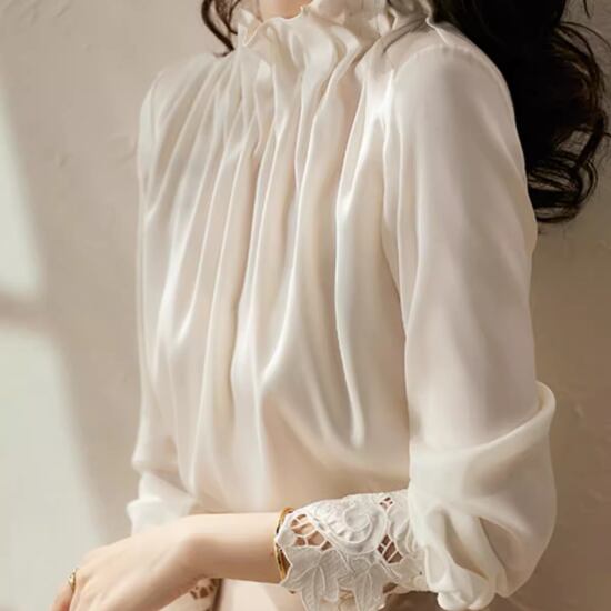 ブラウス レディース 長袖 フリル シャツ レース袖 トップス シャツブラウス ゆったり オシャレ エレガント ハイネック お呼ばれコーデ オフィスコーデ 上品 長袖ブラウス とろみシャツ