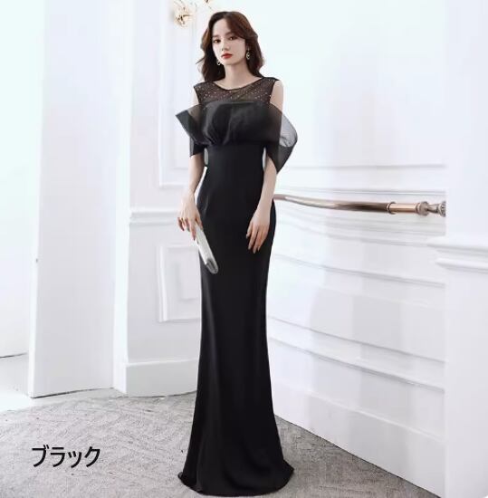 演奏会ドレス レディース パーティードレス 結婚式ドレス ロングドレス ロングワンピース ワンピースドレス 肩出し フリル ラウンドネック スリムフィット きれいめ エレガント スタイリッシュ 女性