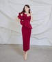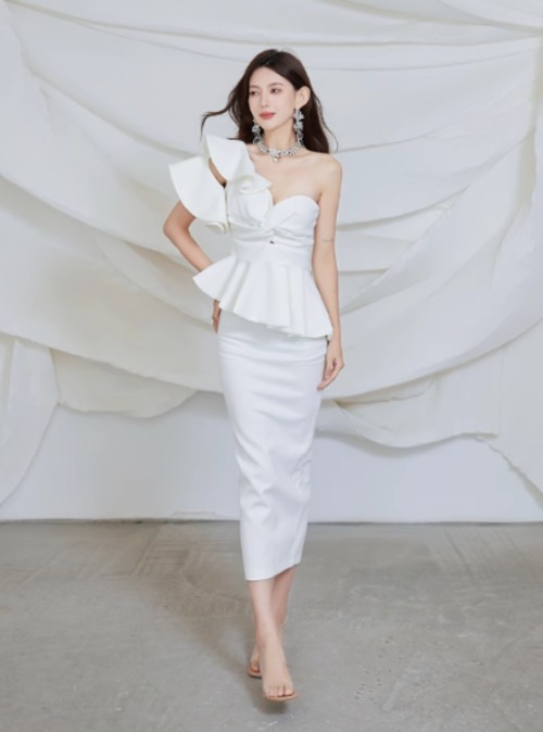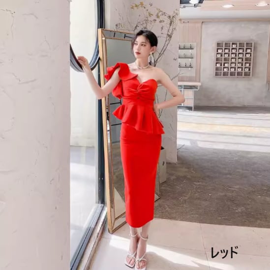 パーティードレス レディース 結婚式ドレス 演奏会ドレス セットアップ 上下セット ツーピース アシンメトリー フリル ボリューム ペプラム タイトスカート ハイウエスト きれいめ エレガント 個性的