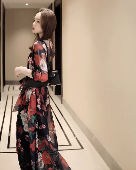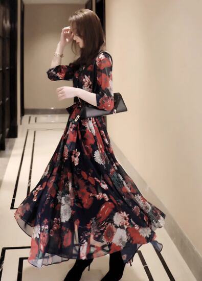 パーティードレス レディース 結婚式ドレス 演奏会ドレス ロングドレス ワンピースドレス ロングワンピース シフォンワンピース 花柄 フラワー Vネック ハイウエスト 5分袖 きれいめ エレガント