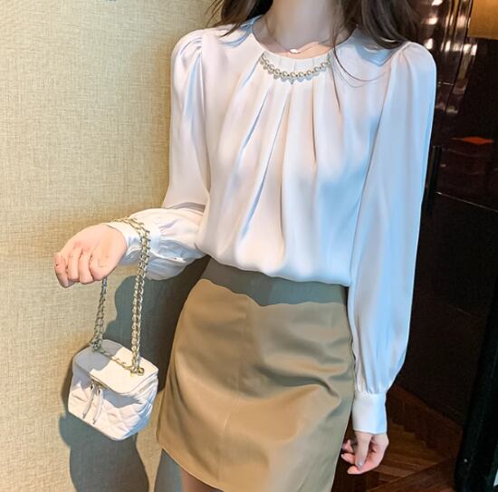 シフォンブラウス レディース トップス シフォンシャツ 長袖ブラウス プリーツ パール ランタンスリーブ ラウンドネック カジュアル お出かけ おしゃれ きれいめ エレガント お呼ばれ パーティー