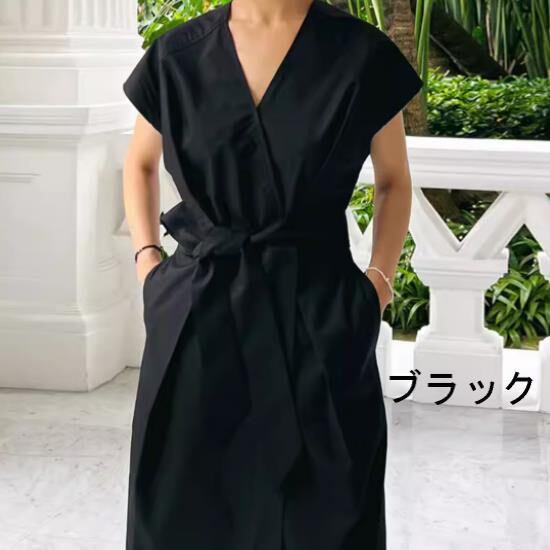 Vネックワンピース レディース レディースワンピース ウエストマーク ウエストリボン ロングワンピース ワンピース Vネック 夏ワンピース 夏 サマーワンピース 半袖ワンピース ベーシック