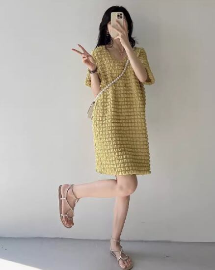 ミニワンピース レディース ワンピース 半袖ワンピース Vネック プルオーバー ショート丈 ワッフル素材 立体的 個性的 カジュアル お出かけ おしゃれ 大きいサイズ 女性 ファッション ミニワンピ