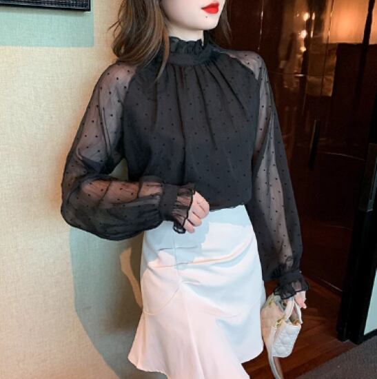 シフォンブラウス レディース トップス シフォンシャツ 長袖ブラウス シースルー ドット柄 水玉 フリルネック スタンドカラー 黒 ブラック きれいめ エレガント カジュアル お出かけ おしゃれ 女性