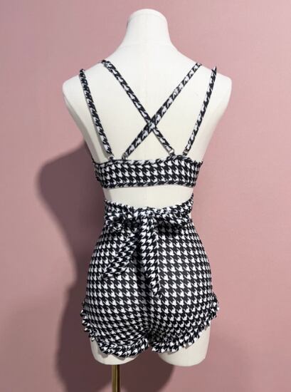 ビキニ レディース 水着 セパレート 上下セット 千鳥格子柄 フリル ショートパンツ ハイウエスト ホルターネック バックリボン クロスデザイン スイムウェア ビーチウェア 海 夏 バカンス プール