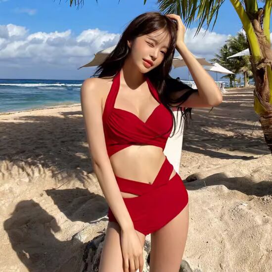 ビキニ レディース 水着 セパレート水着 スイムウェア ビーチウェア ホルターネック クロスデザイン セクシー カジュアル 赤 レッド 上下セット ツーピース 海 夏 ビーチ バカンス プール 女性
