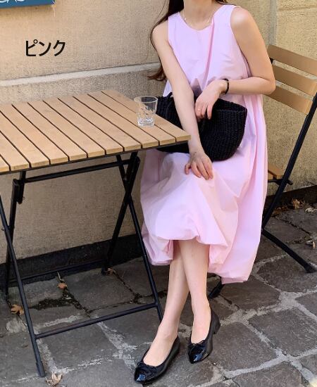 ノースリーブワンピース レディース ワンピース ミモレ丈ワンピース バルーンスカート ふんわり ボリューム シンプル 無地 ゆったり 体型カバー 春夏 ラウンドネック カジュアル お出かけ おしゃれ