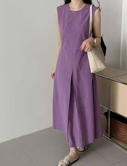 ノースリーブワンピース レディース ワンピース ロングワンピース シンプル 無地 ラウンドネック ゆったり 体型カバー コットン 綿 カジュアル お出かけ おしゃれ 春夏 ハイウエスト Aライン