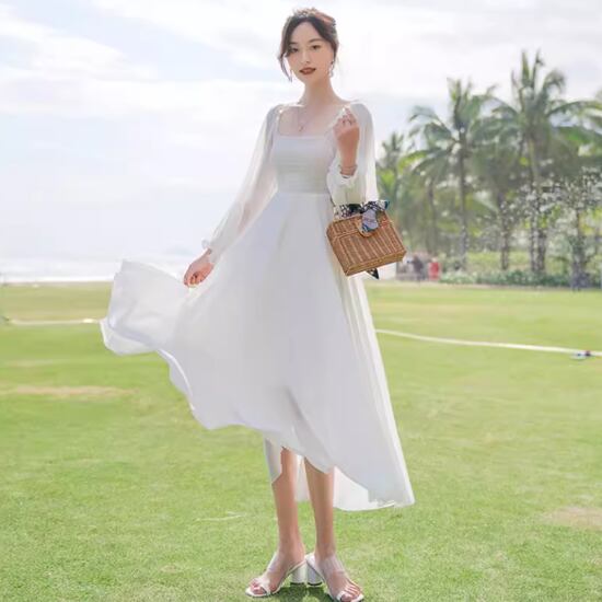 リゾートワンピース レディース ワンピース ミモレ丈ワンピース 長袖ワンピース スクエアネック オフショルダー ハイウエスト キャンディスリーブ Aラインスカート シースルー きれいめ カジュアル