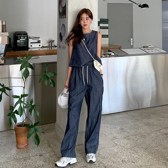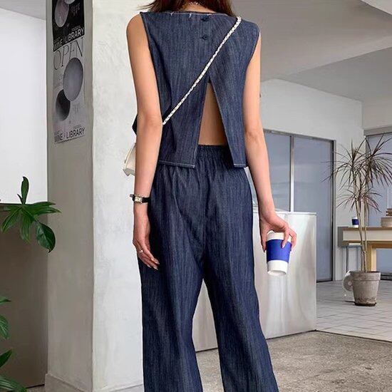 セットアップ レディース ワイドパンツ 夏ノースリーブブラウス 背中あき バックオープン シャツ デニムガウチョパンツ タンクトップ カジュアル ゆったり ダンガリー 無地 ロング デニム セクシー