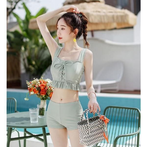 レディース 水着 女性 3 点セット 女子学生 スカートスタイル 平角 セクシー 小胸 お腹をカバーして痩せて見える 韓国 妖精 温泉 グリーン 緑 20代 30代